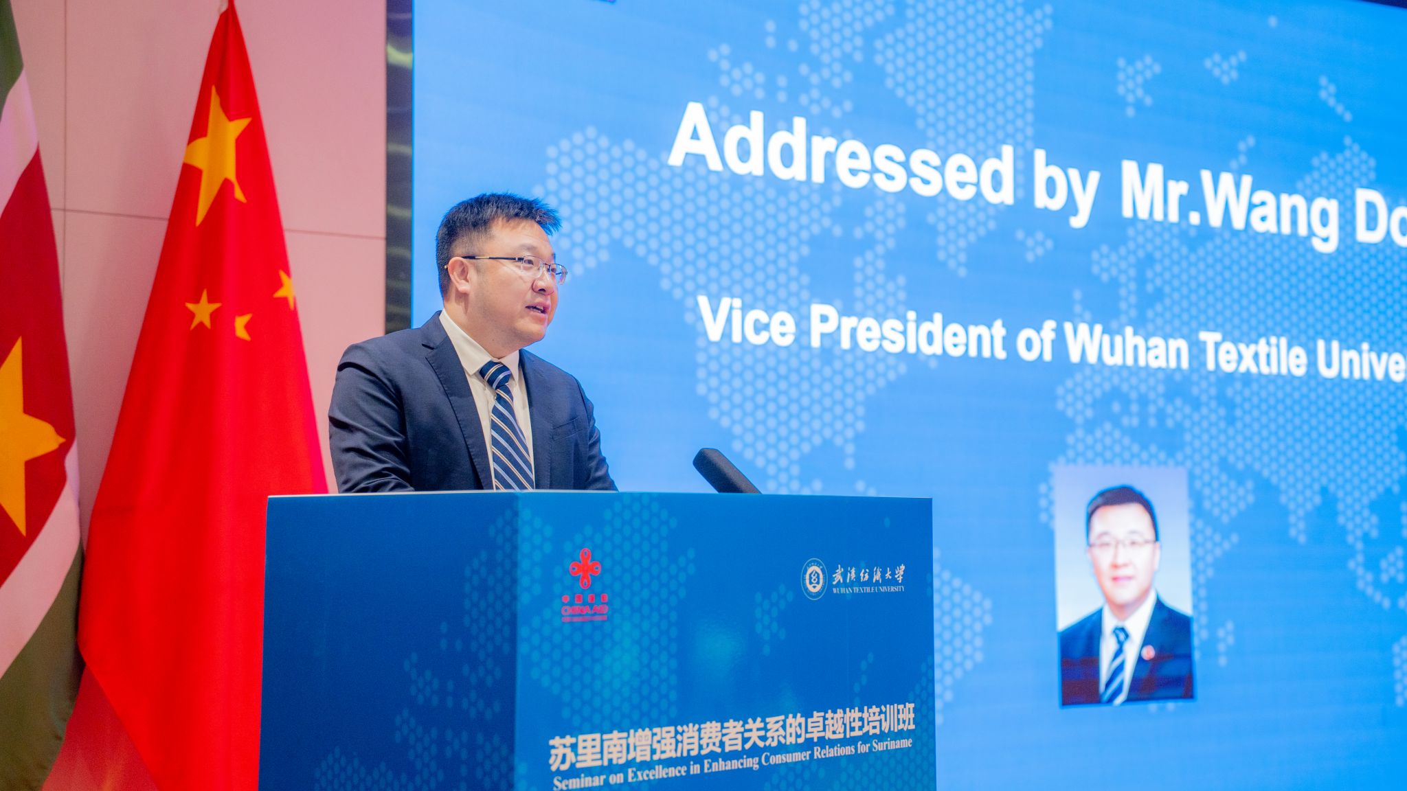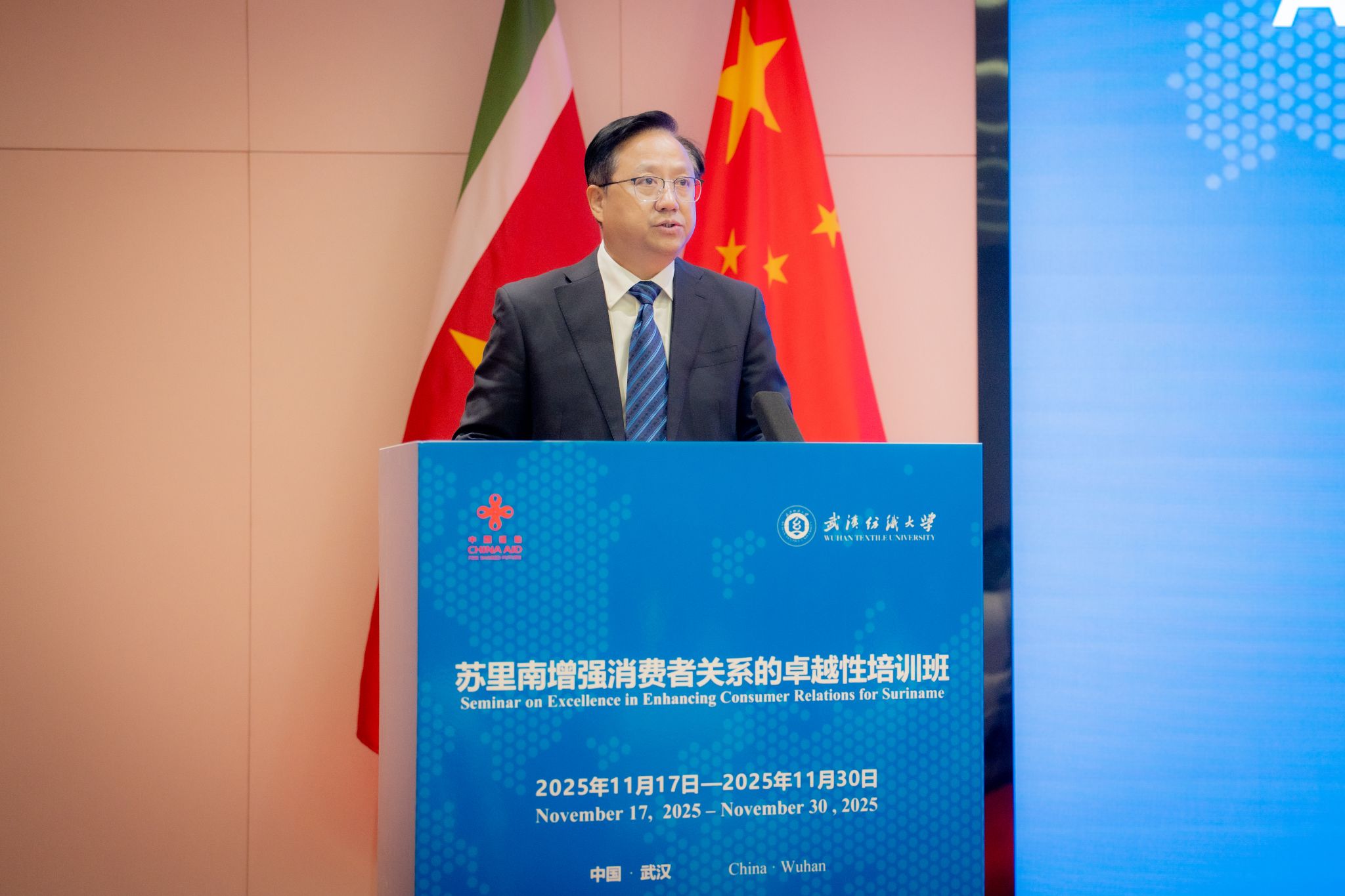11月18日,由商务部主办、学校承办的苏里南增强消费者关系的卓越性培训班在阳光校区建全会堂隆重启幕。商务部国际商务官员研修学院副院长徐凯,湖北省商务厅一级巡视员陈华荣、外经管理处处长黄文华,商务部驻武汉特派员办事处副特派员张楚虎、副处长欧阳强兵,武汉纺织大学副校长王栋等中方代表与培训班代表团团长、苏里南经济事务与科技创新部常务秘书苏拉克莎女士,以及该国25名政府官员共同出席开班仪式。