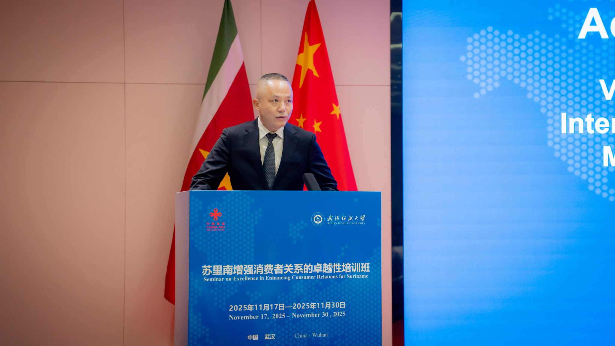 王栋对苏里南代表团及中方嘉宾的莅临致以热烈欢迎。他表示,学校始终坚持以科技创新服务国家战略,在推动“一带一路”倡议下为发展中国家培养了大批高层次人才。他指出,本期培训班紧密围绕苏里南国家发展需求,旨在搭建中苏在市场治理与消费生态建设共享平台,拓展双方在人才培养与产业协同等方面合作,擘画交流互鉴、合作共赢新蓝图。