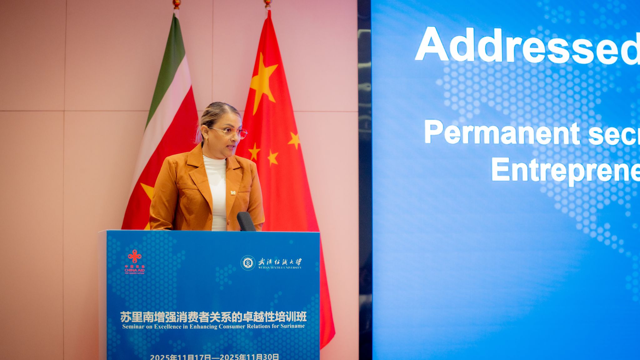 (苏里南经济事务与科技创新部常务秘书苏拉克莎发言)