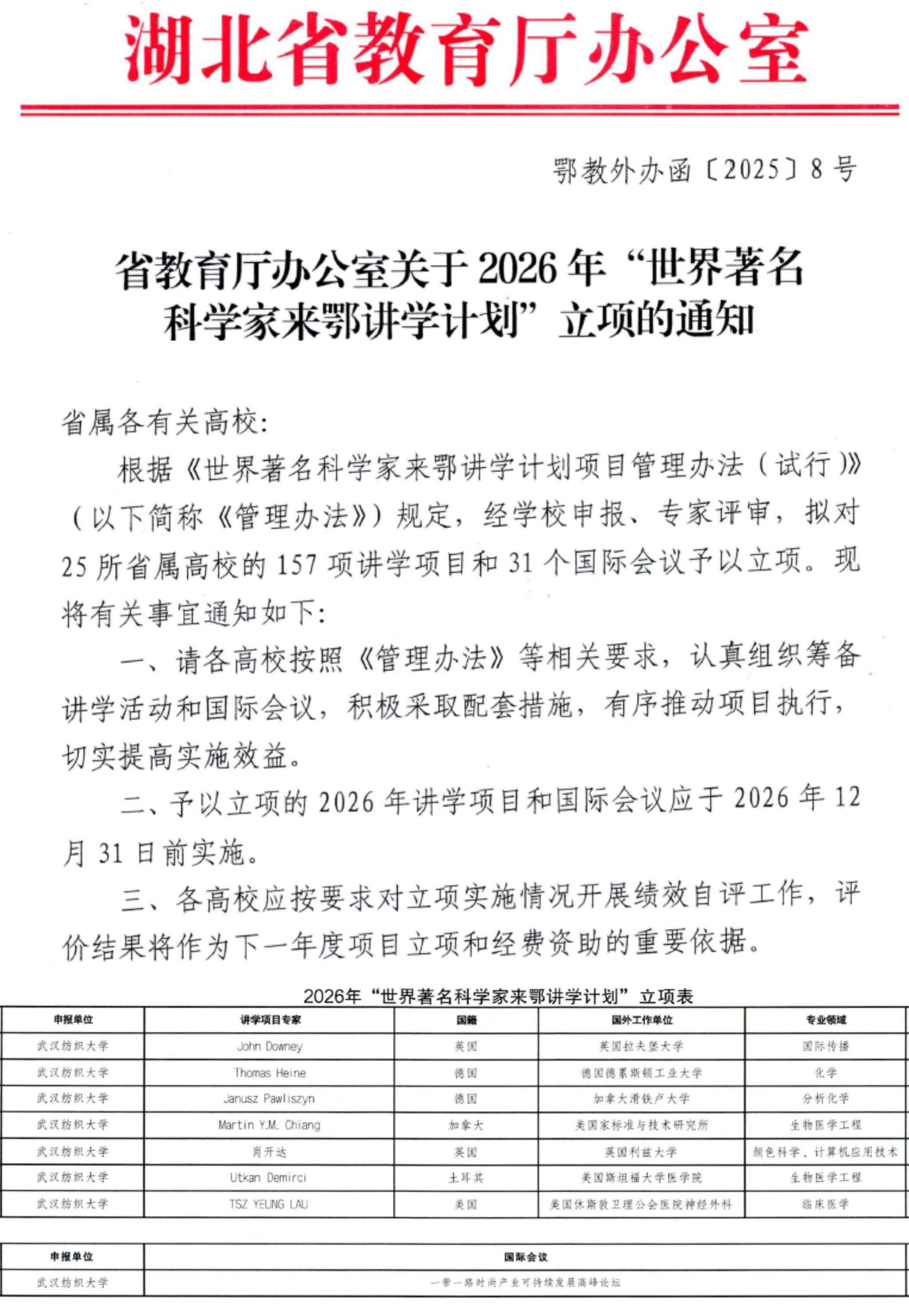 该计划是湖北省专项支持高校引进国际知名学者来鄂开展讲学访问与学术交流的重要平台。依托该平台,学校先后邀请了近50位世界级学者来校讲学,助力学科建设迈向世界前沿水平。此次多个项目获批,将进一步推动我校汇聚一批世界顶尖科学家来校开展国际学术交流,从而拓展师生全球视野并促进高水平科研合作,持续提升学校社会影响力与国际声誉度。